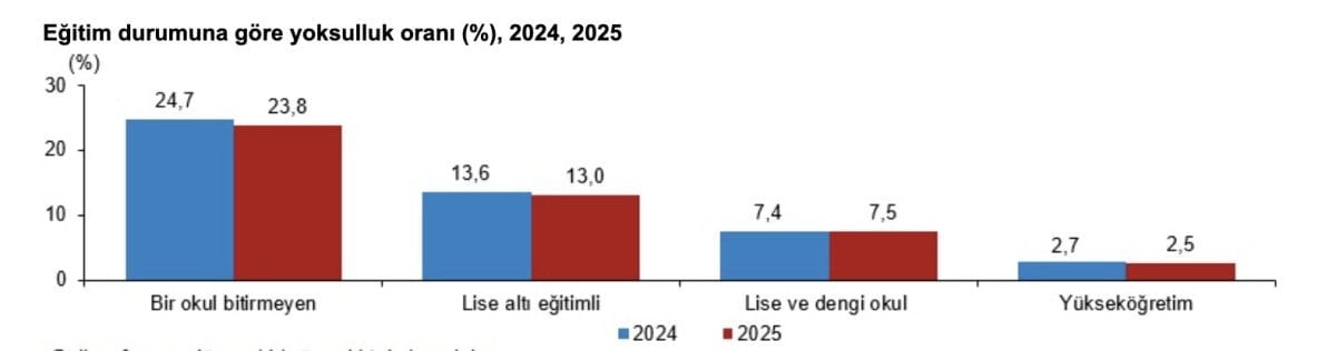 Eşdeğer hanehalkı kullanılabilir fert medyan gelirinin yüzde 50’si dikkate alınarak hesaplanan yoksulluk oranına göre; bir okul bitirmeyenlerin yüzde 23,8’i, lise altı eğitimlilerin yüzde 13,0’ı, lise ve dengi okul mezunlarının ise  yüzde 7,5’i yoksul olarak hesaplandı. Yükseköğretim mezunları ise yüzde 2,5 ile en düşük yoksulluk oranına sahip grup oldu.