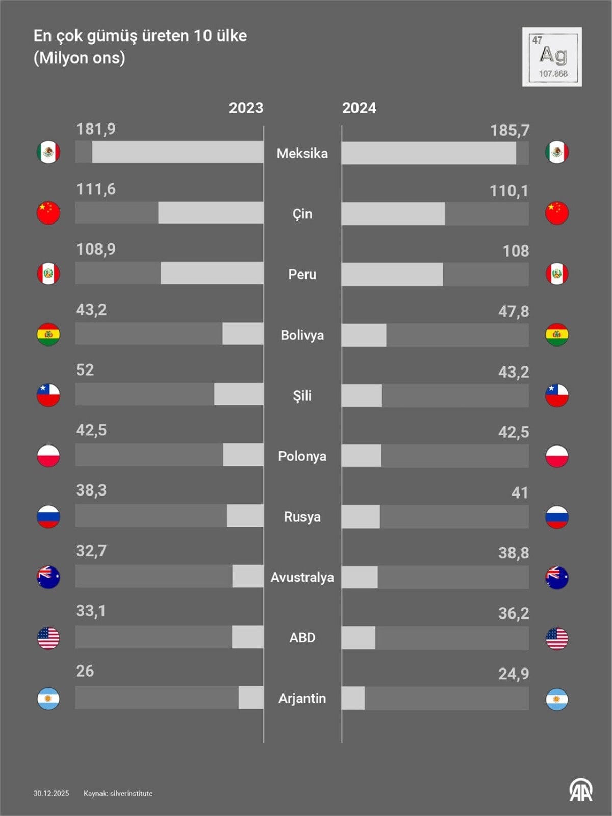 Tablo, 2023 ve 2024 yıllarında en çok gümüş üreten 10 ülkeyi (milyon ons cinsinden) karşılaştırıyor. 2024’te birçok ülkede artış görülürken, Çin, Peru, Şili ve Arjantin’de hafif düşüşler var.
