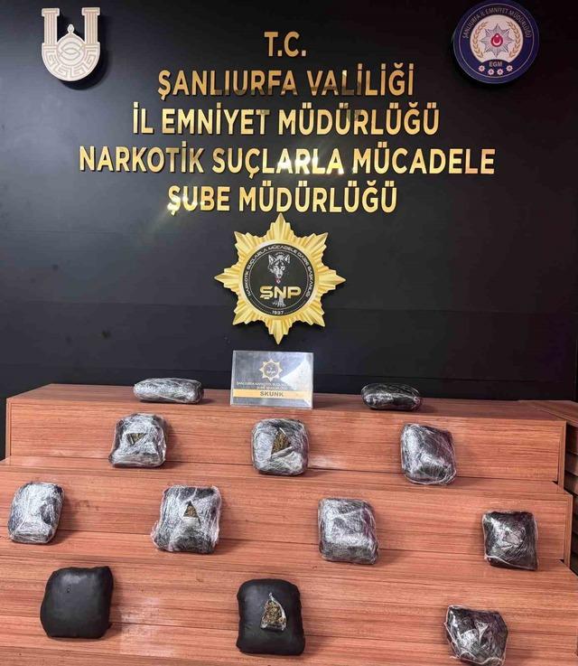 Edinilen bilgiye göre, Şanlıurfa İl Emniyet Müdürlüğü Narkotik Suçlarla Mücadele Şube Müdürlüğü ekipleri, bir aracı durdurarak içerisinde arama yaptı. Arama sırasında bir valizi açan ekipler, 12 parça halinde poşetlenmiş 8 kilogram skunk maddesi ele geçirdi.